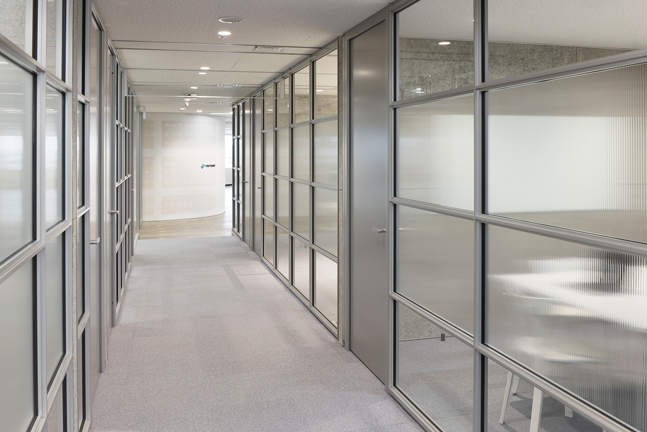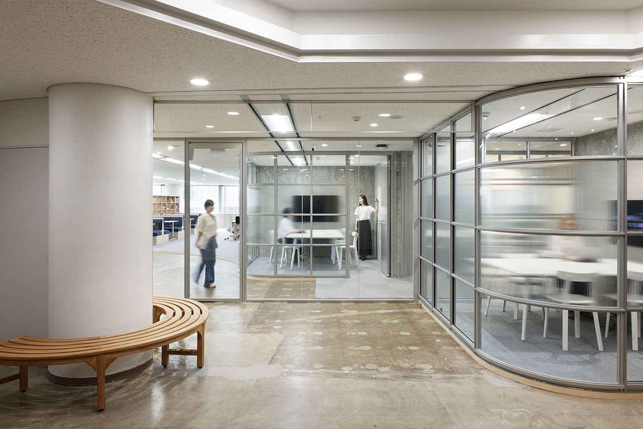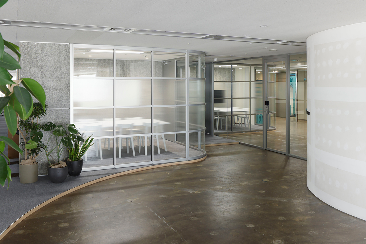 ミーティングスペースは閉じすぎず、リブガラスによる仕切りで“開かれた個室”とし、可視性とプライバシーのバランスでユートラストらしさを表現。エントランスは角を取り、来訪者をやわらかに迎え入れる動線とした。